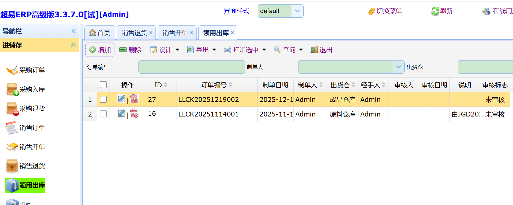 点击 【增加】,即可增加一个领料出库单。