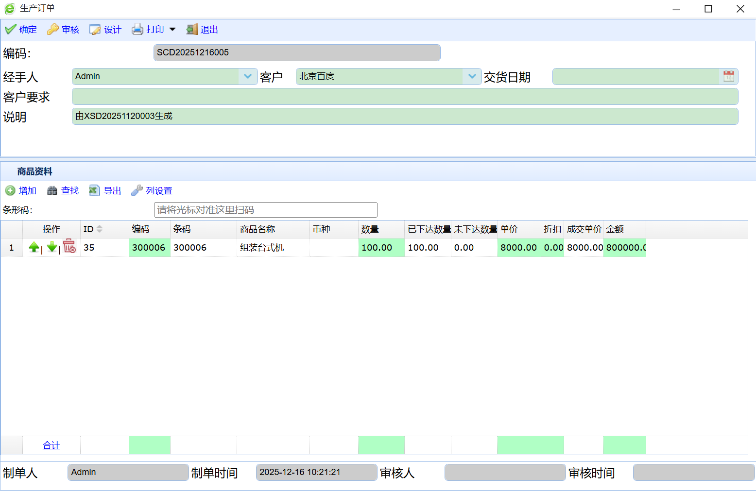 生产订单录入界面