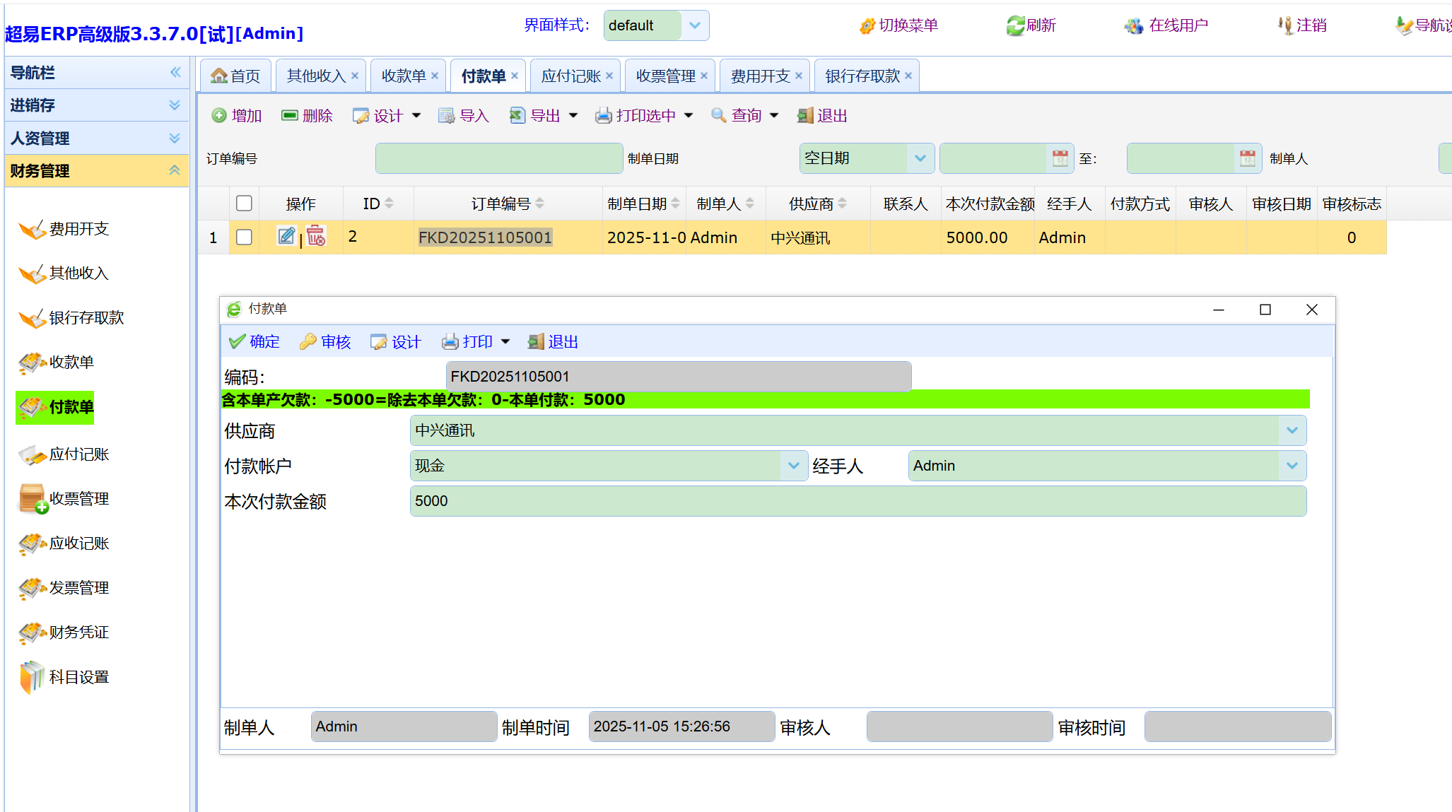 操作入口位于【财务管理】模块下,点击【付款单】即可进入对应界面,它是处理企业向供应商支付款项的账务工具,针对对象为合作供应商(如截图中的 “中兴通讯”),核心作用是记录向供应商的付款、管理应付账款状态。
