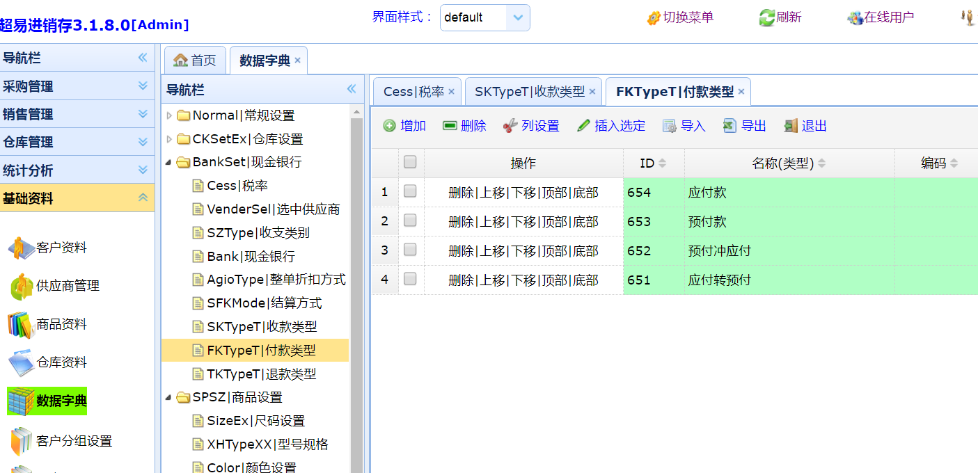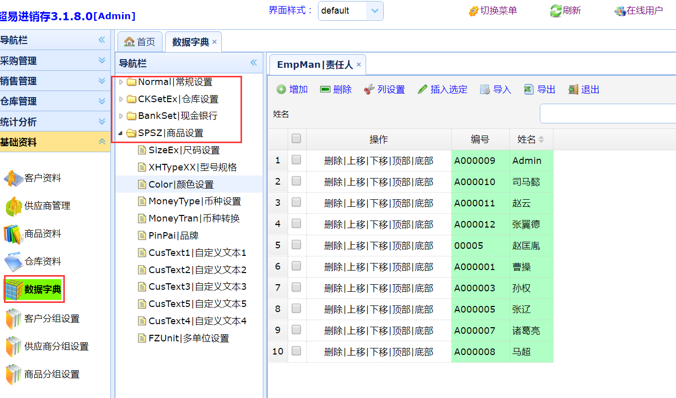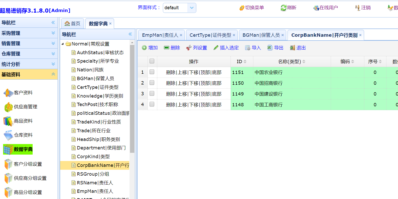 主要是针对进销存单据中的一些下拉字段,进行数据字典设置,例如开户行类别,使用部门,人员配置等,人事资料中的民族,所学专业等等。