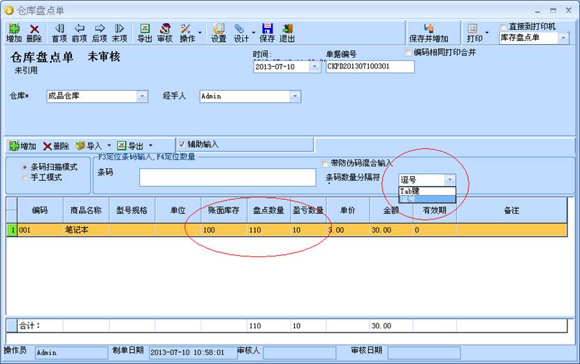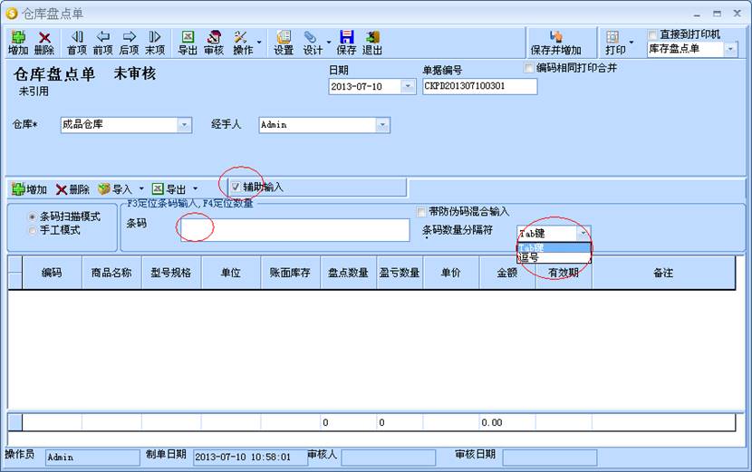 之后打开软件中库存盘点一项,选择辅助输入,光标移到条码选项。条码分隔符可以选择TAB键或是逗号。