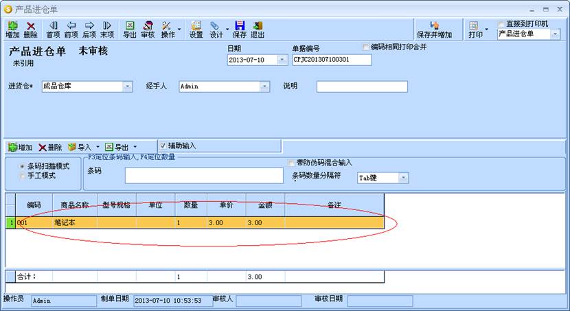 通过条码扫描进行商品初始化入库,选择辅助输入,光标移到条码选项,对该商品进行条码扫描。
