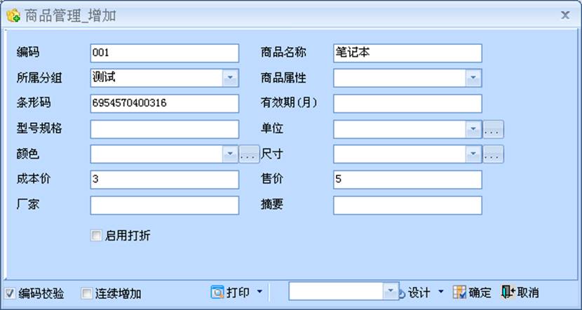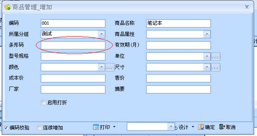 首先在商品资料里增加商品资料,将光标移至条形码输入框