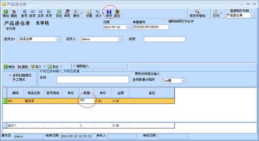 扫描后自动增加商品信息,可以输入相关数量之后保存