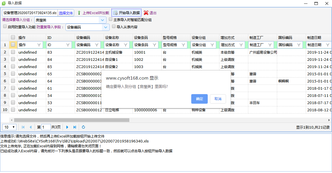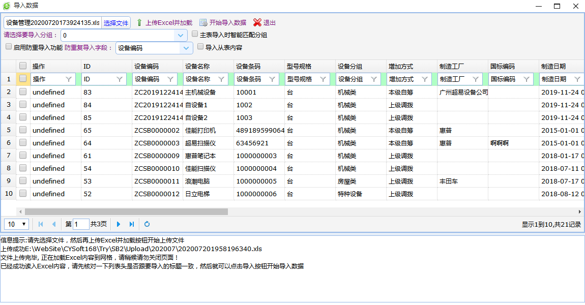 6. 关于日期型字段,例如【签订日期】,如果Excel中没有【签订日期】那么导入成功后,【签订日期】会显示为当前日期。如果想让【签订日期】为空,那么EXCEL中必须对应有【签订日期】这一列,并且数据为空值。