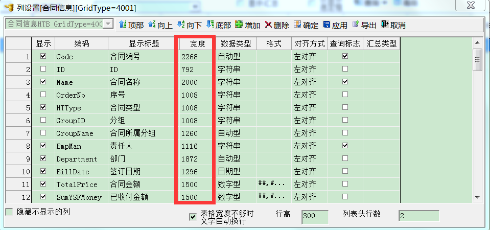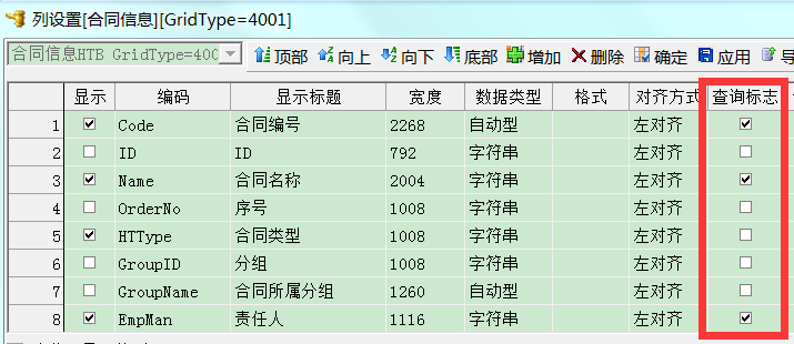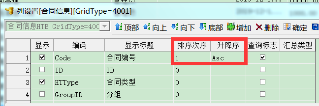 排列顺序序号非常重要,例如上图在列设置【合同编号】的排列顺序为1,而且是升序方式。设置好之后,重新点一下合同左上角的分组,排序就生效了,按合同编号的升序方式排列。