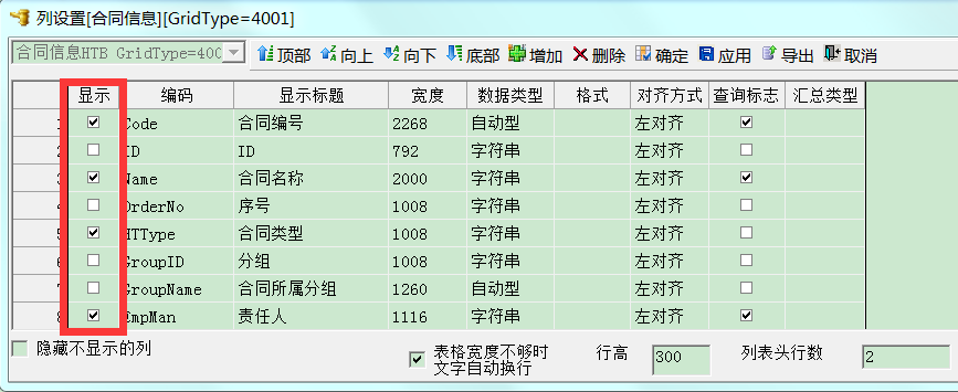 同上,在合同台账空白处点右键【显示隐藏列】,即可进入【列设置】界面。