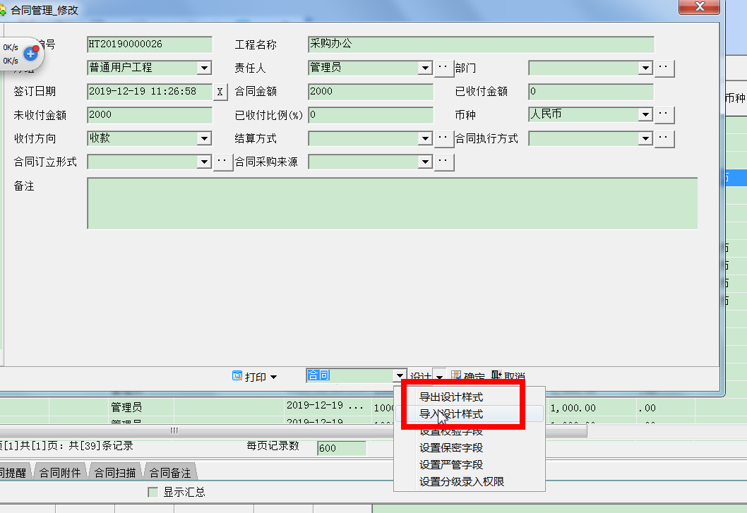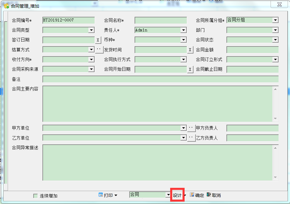 如上图,在新增合同的录入界面点【设计】按钮。注意:是点【设计】,不要点【设计】旁边的倒三角。