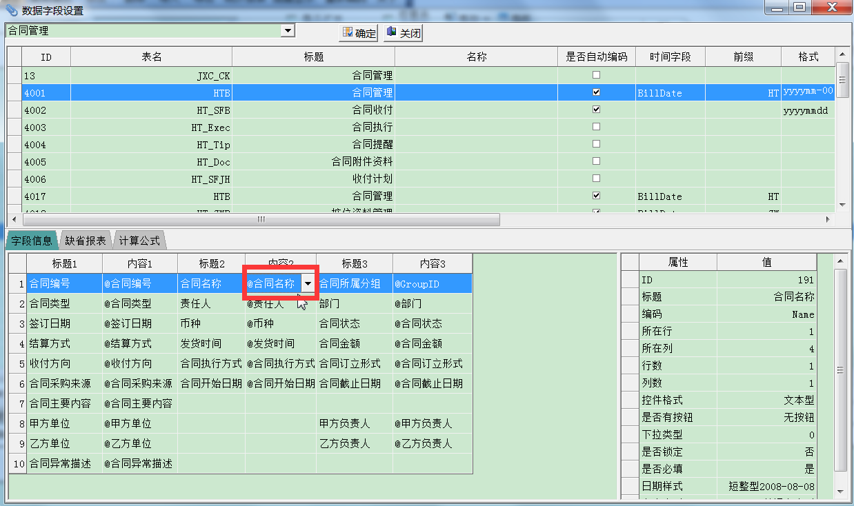 点【合同名称】的内容那一列,会出现一个下拉符号,点中这个下拉符号,把【合同名称】选择为【工程名称】,然后点【确定】。 这个地方要注意从内容字段那一列开始点选字段,相对应的标题列字段会自动改变。