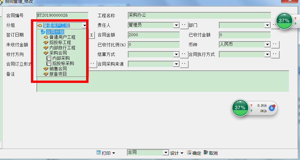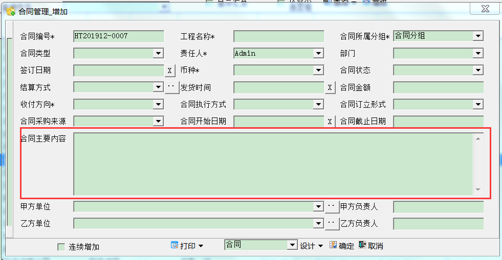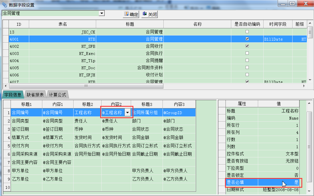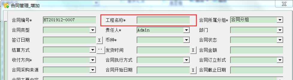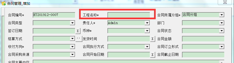 如上图,【工程名称】带了*号,带*号的字段表示必填,不能为空。录入合同的时候,必须字段必须填写,否则无法保存。