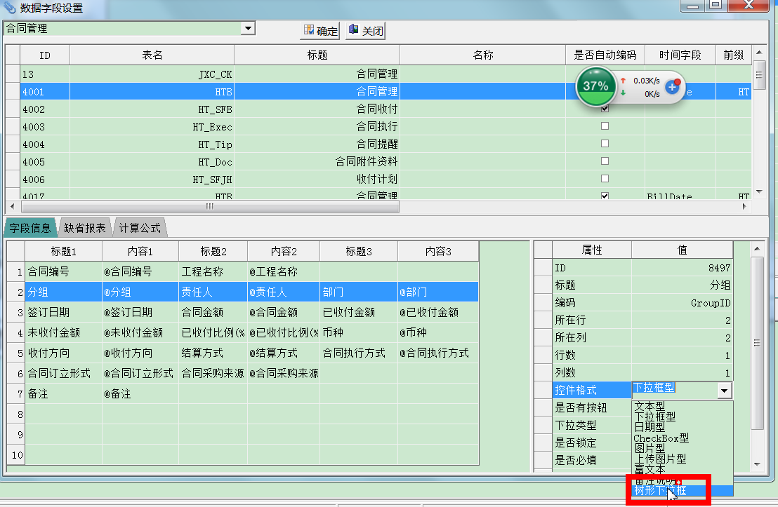 树形下拉型:V3.69版本支持,主要针对分组等字段支持。