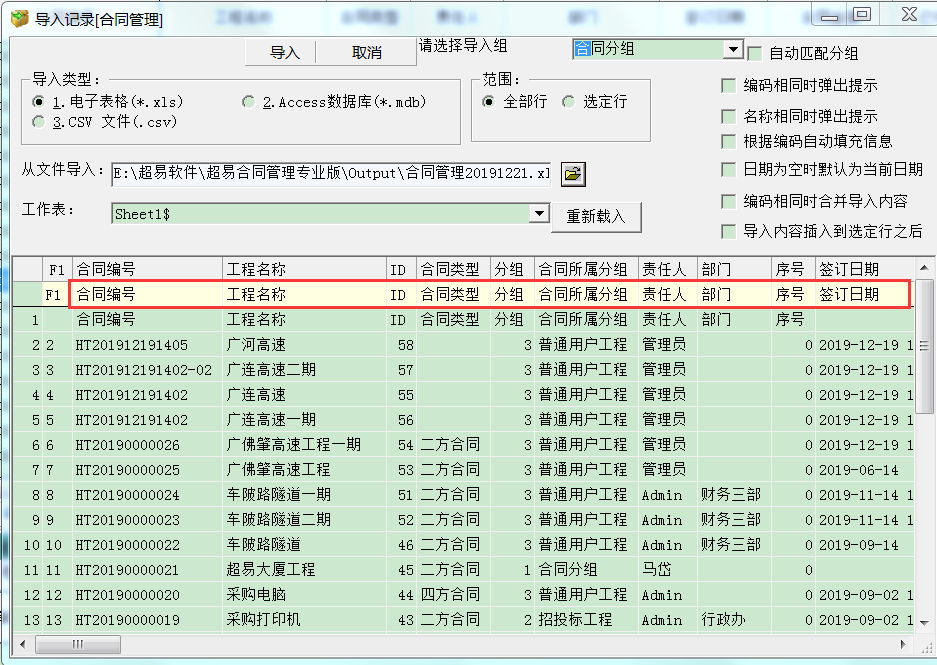 拿到一张EXCEL表格,要导入到合同台账里面去,如下图: