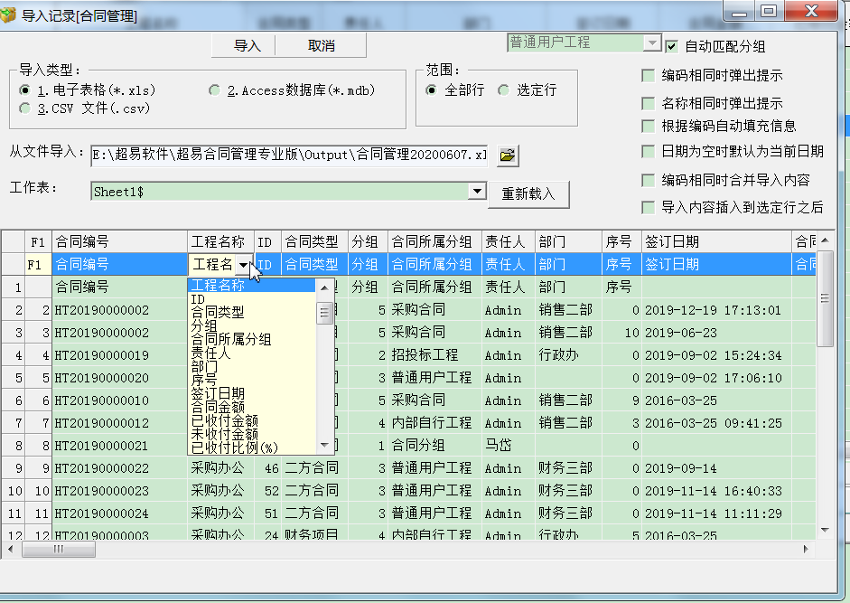 在浅黄色那一行,点一下列名称,把它们一一选择为跟软件里面显示的列名称相同,即可把这些列的内容导入到合同台账里面去。