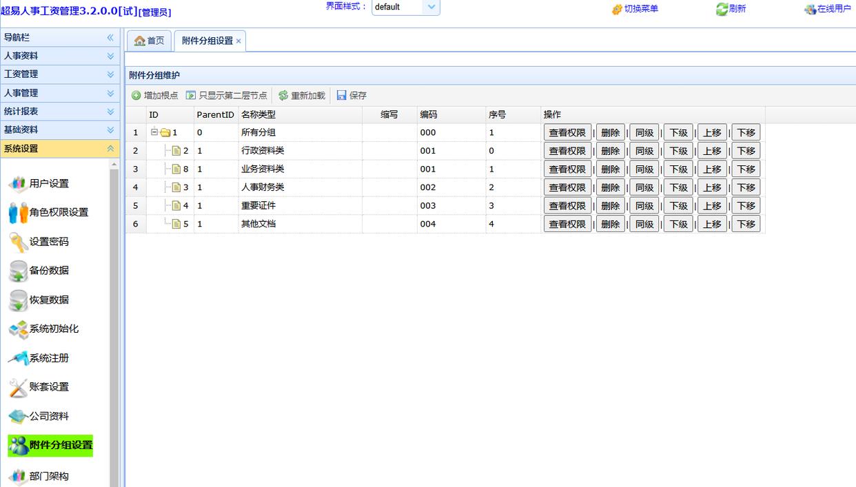 5.在【系统设置】-【附件分组设置】中,设置附件分组,以及给不同的操作员授予不同附件组的查看权限。