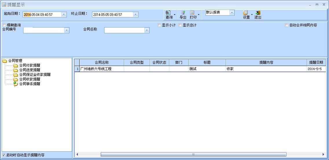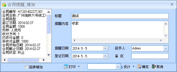 1、设置合同提醒内容。选中需要提醒的主合同,在合同提醒界面点击增加按钮,输入标题、提醒内容、提醒日期等内容,确定保存,如下图: