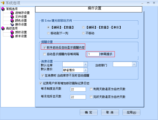 2、系统设置:在系统选项中设置好提醒方式,在操作设置里面勾选软件启动后自动显示提醒内容,设置好提醒时间,如设置是1分钟,那么在软件登陆1分钟之后软件会弹出提醒,如果反复提醒,那么在自动显示提醒内容每间隔前面打上勾,如下图: