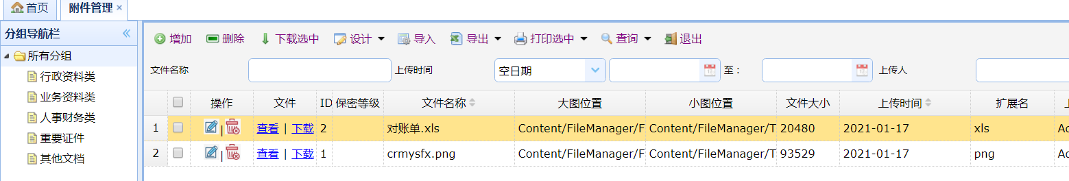 点击左侧导航栏,选择-【系统管理】-【附件分组设置】,进入到附件分组设置。附件分组设置是支持无限制分组设置的,具体可以参考系统管理-部门架构管理功能的。
