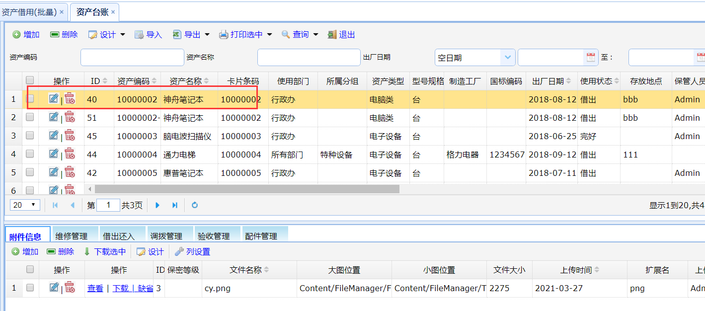 可以在附件管理单独界面中显示,也可以在固定资产台账汇总,直接查看某个固定资产下面的附件。