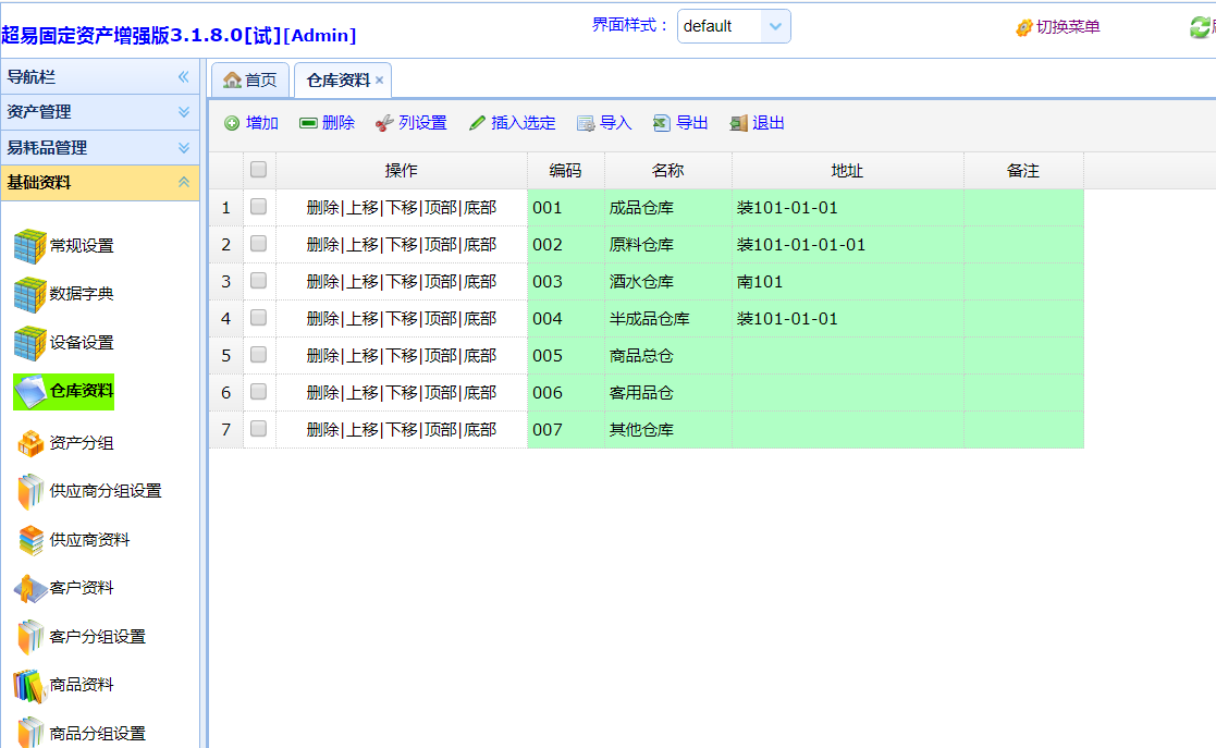 各种出入库操作中,都需要选择进出仓资料,所以必须在这里进行完善仓库设置。