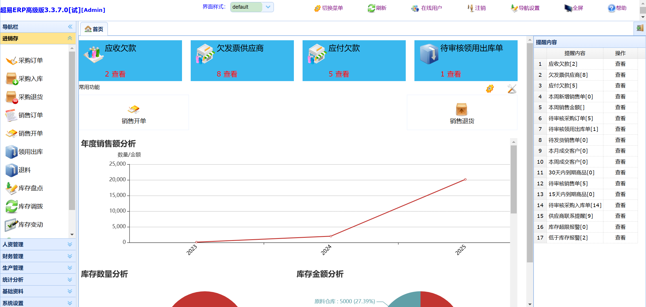 超易ERP是广州市超易信息科技有限公司积淀 17 年打造的一体化企业管理系统,专为生产制造、贸易、零售等行业中小企业量身定制,已赢得万+企业认可与信赖。系统聚焦企业核心管理痛点,构建起覆盖进销存、生产、财务、人力资源的全流程管控体系,提供标准版、专业版、高级版阶梯式解决方案,适配从基础管理到全维度管控的不同需求。