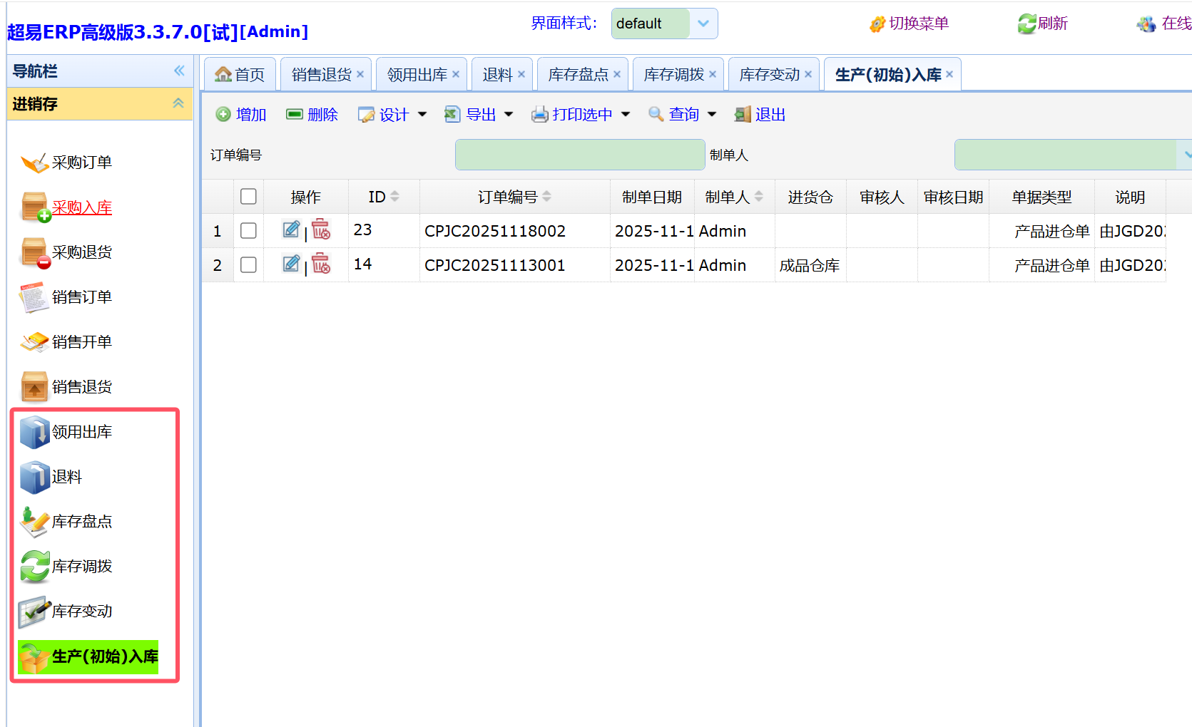操作入口很明确:在左侧【进销存】模块下,点击【生产 (初始) 入库】选项,就能进入操作界面(截图里的 “产品进仓单”,就是初始化入库生成的单据)。