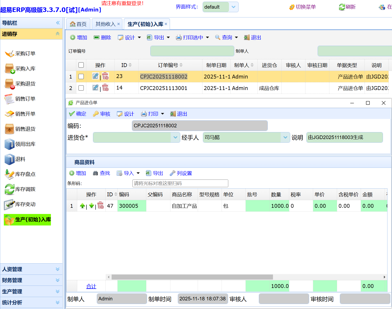 操作入口很明确:在左侧【进销存】模块下,点击【生产 (初始) 入库】选项,就能进入操作界面(截图里的 “产品进仓单”,就是初始化入库生成的单据)。