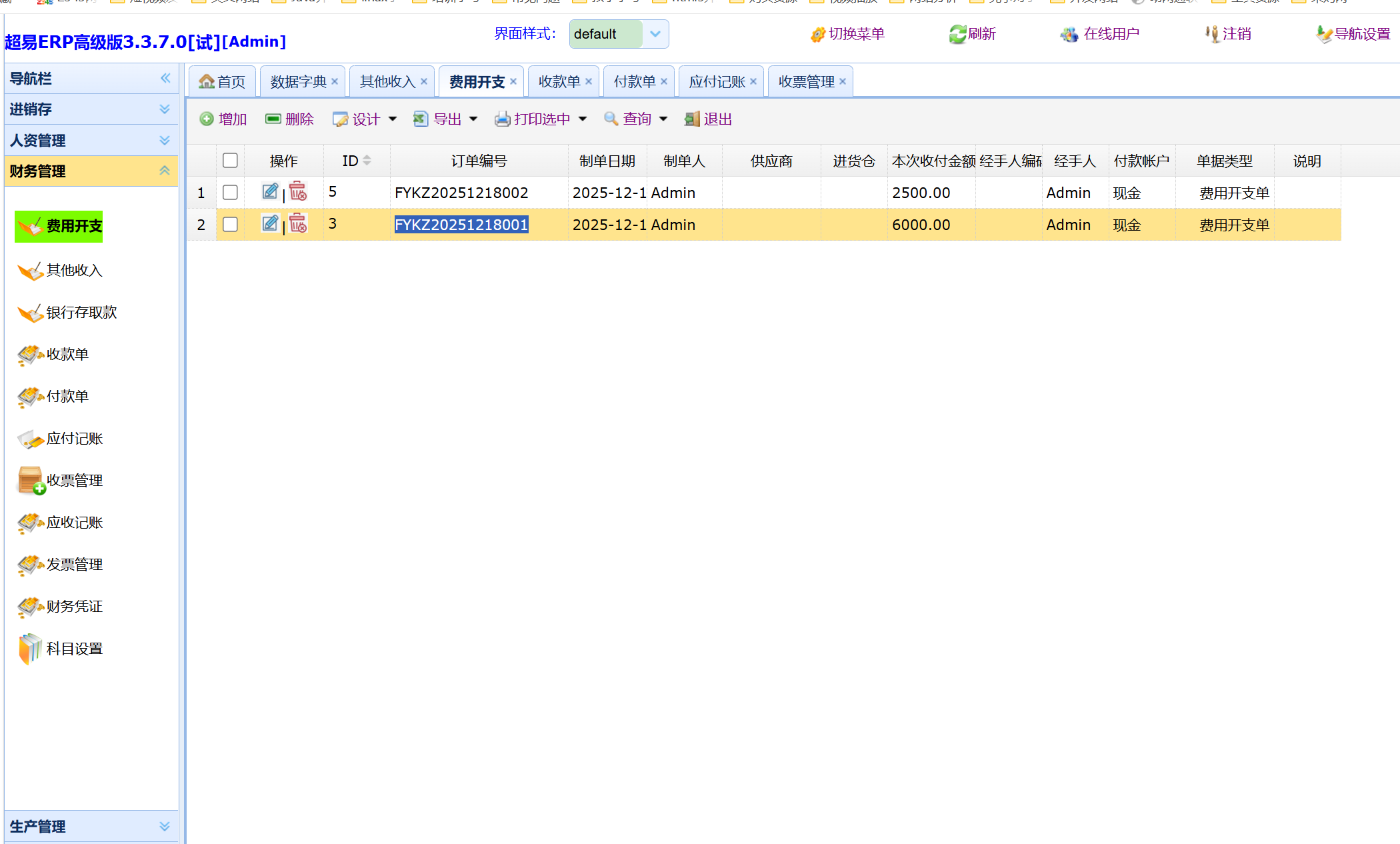 它用于登记各类运营支出(如办公费、差旅费等),界面支持填写订单编号、制单日期、制单人、款项类型等信息,明确每笔支出的明细与归属。