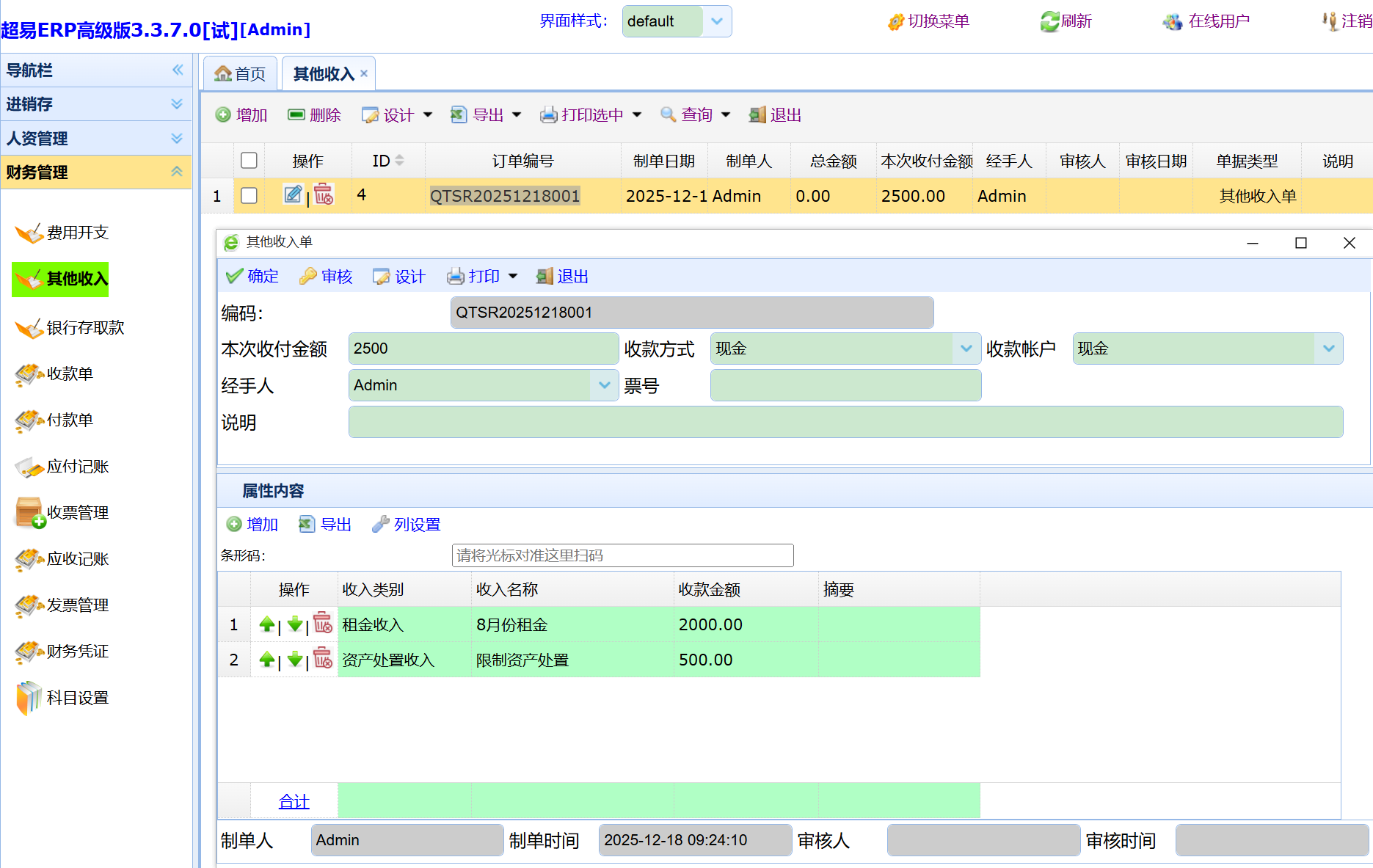 它是专门记录主营业务之外各类零散收入的工具 —— 比如截图里的 “8 月份租金”“限制资产处置收入”,像租金、资产处置、偶然收益这类不是销售 / 采购产生的收入,都靠这张单据统一登记,确保企业所有收入都有据可查,财务账目不遗漏任何一笔资金流入。