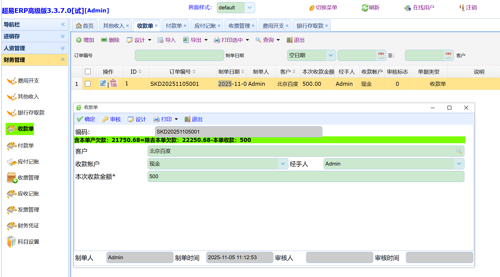 操作入口位于【财务管理】模块下,点击【收款单】即可进入对应界面,它是专门处理企业与客户间款项收取的账务工具,针对对象为企业的合作客户(如截图中的 “北京百度”)。
