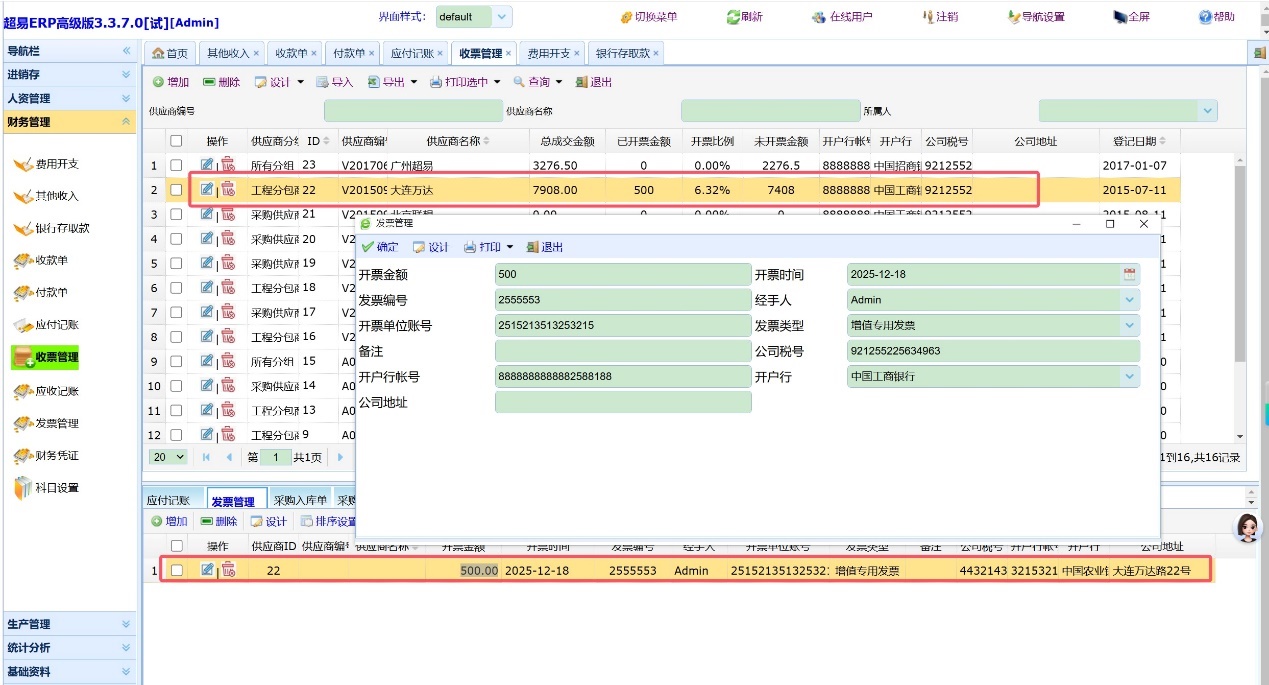 - 选对应的【供应商】,填好这次收到的【开票金额】【发票编号】【发票类型】等信息;