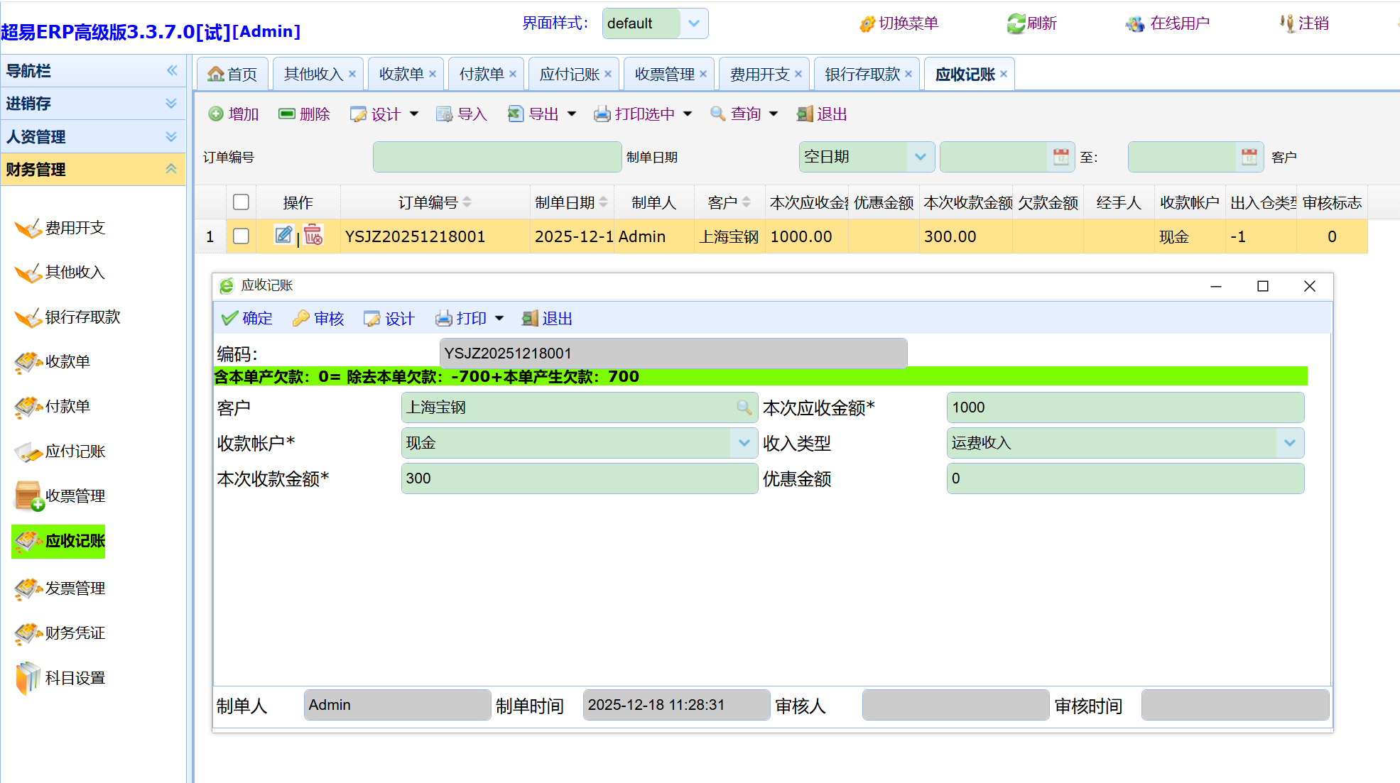 它的作用就像你和客户之间的 “欠款追踪小账本”—— 比如和截图里的 “上海宝钢” 合作,这次该收对方 1000 元,但实际先收了 300 元,这个工具能帮你记清楚 “客户还欠多少”“已经收了多少”。既不会忘了催客户付尾款,也不会重复收钱得罪合作方,让客户的应收账款账目明明白白,回款进度一眼就能看到,再也不用翻一堆笔记对账啦。