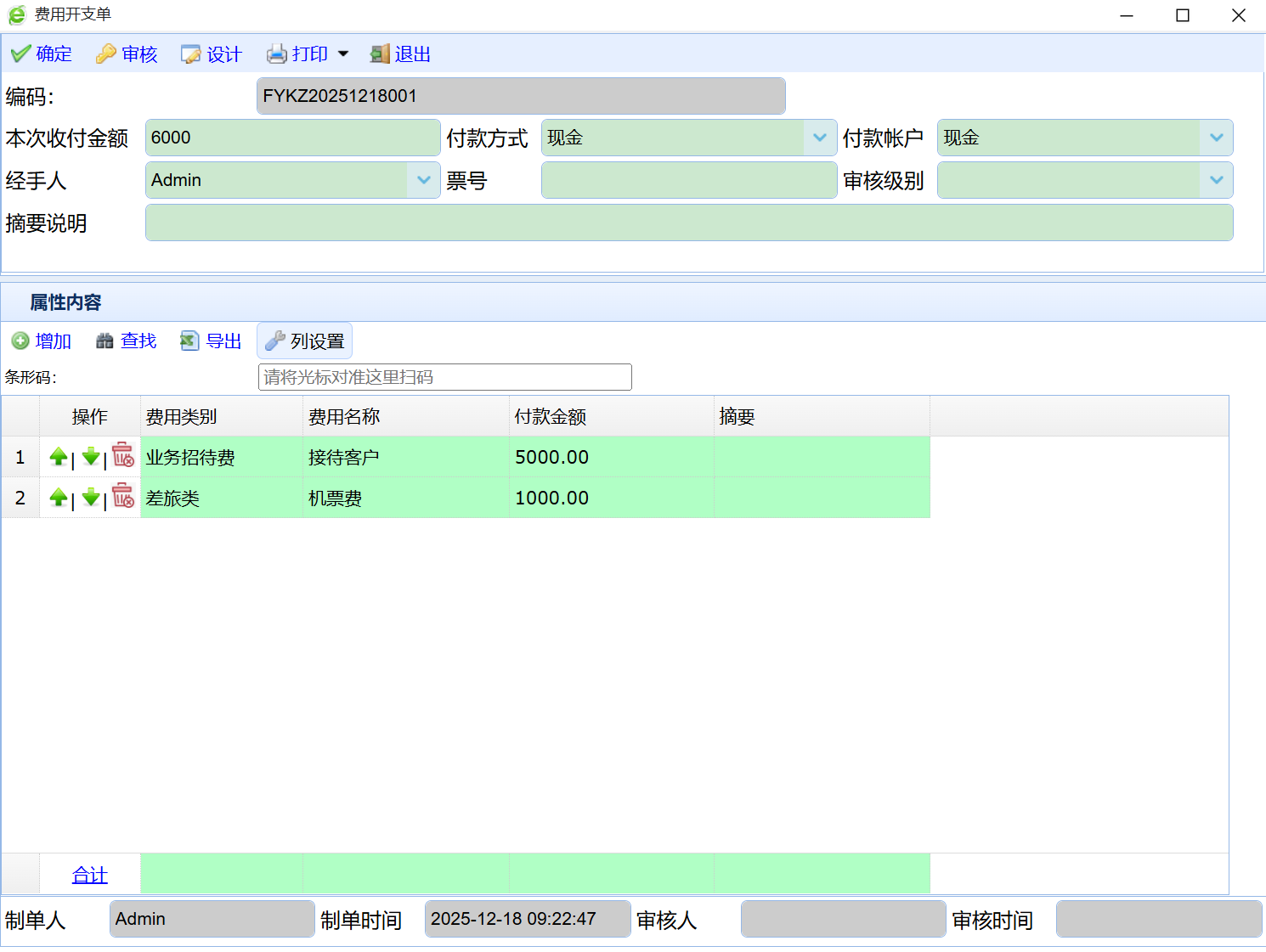 它用于登记各类运营支出(如办公费、差旅费等),界面支持填写订单编号、制单日期、制单人、款项类型等信息,明确每笔支出的明细与归属。