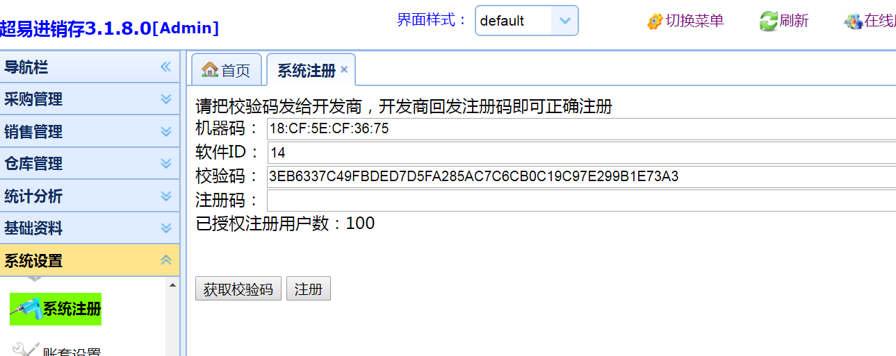 注册前需要把校验码发给我司,由我司进行正版ERP管理系统注册(如下图)。