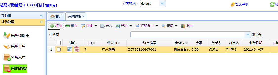 点击-导航栏-【采购退货】-【增加】即可增加一张采购退货单。