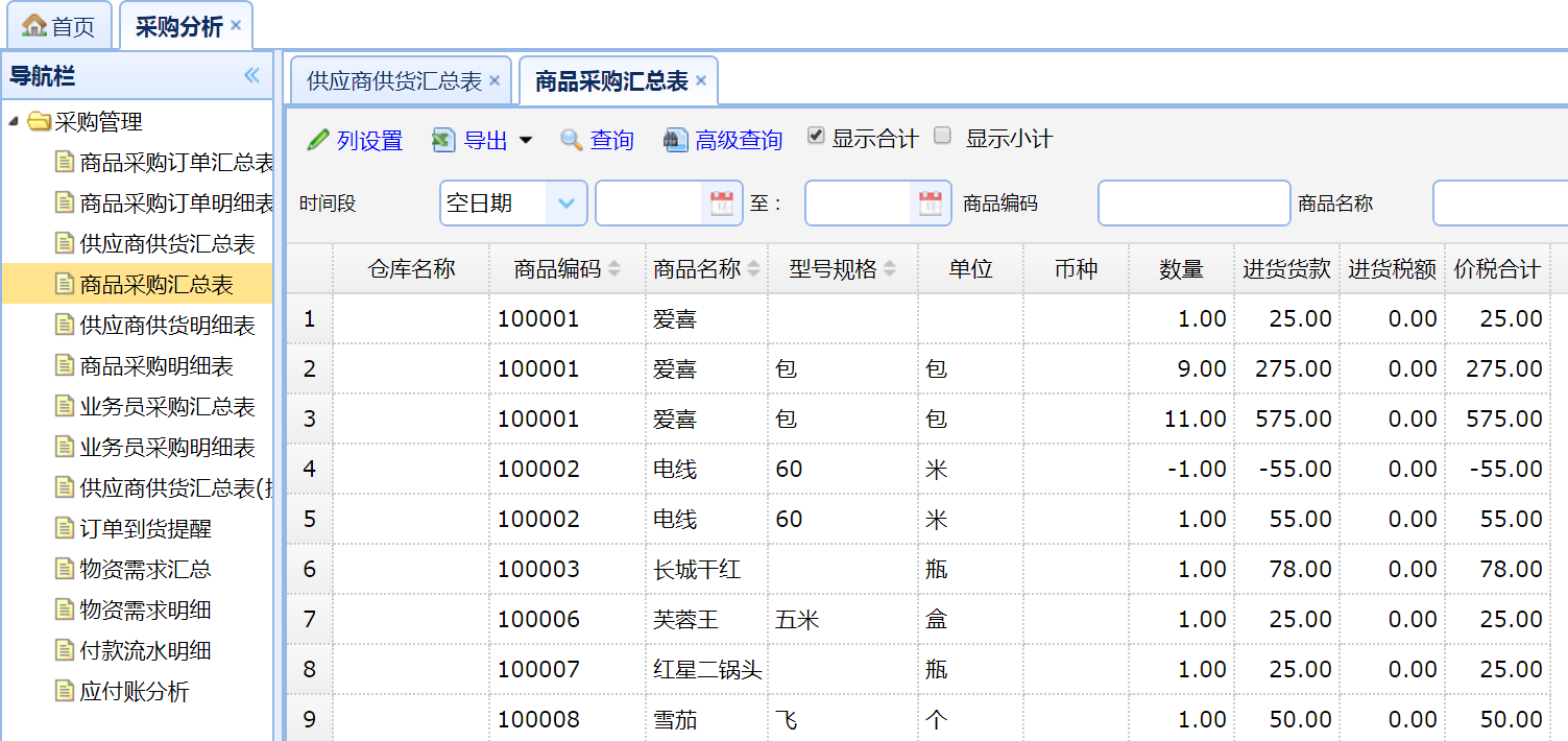 商品采购汇总表:按照商品汇总统计,总共采购的数量,金额等。