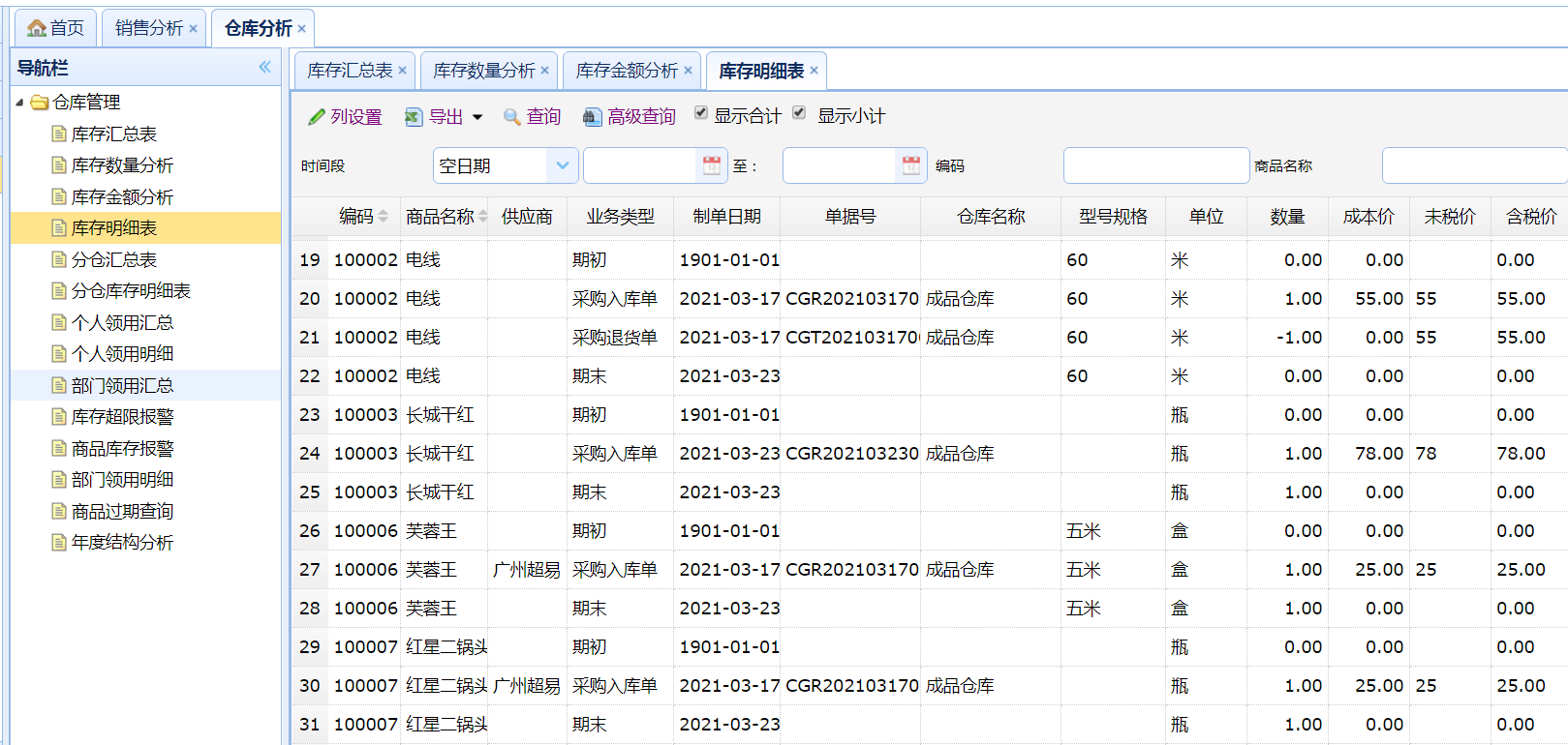 最常用报表,可以查看商品的某段时间内,期初库存,本期出入库,期末结存。