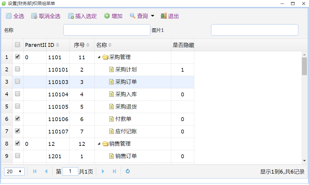 选择某个权限组,勾选要操作的功能点,然后选择【插入选定】即可。