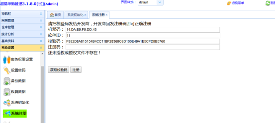 注册前需要把校验码发给我司,由我司进行正版采购管理软件注册(如下图)。