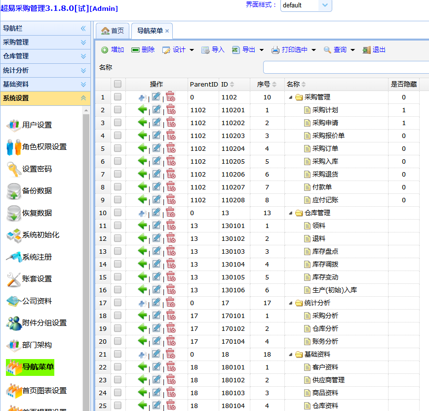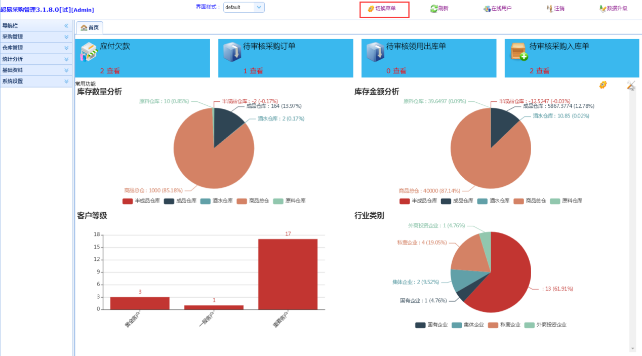 超易采购管理软件支持 导航模式和菜单模式切换。