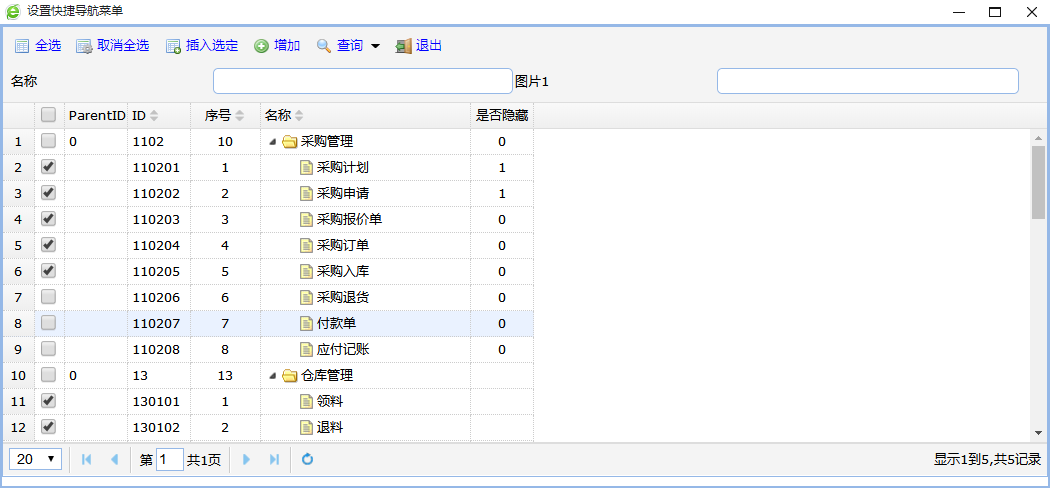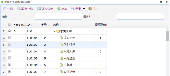 选择某个权限组,勾选要操作的功能点,然后选择【插入选定】即可。