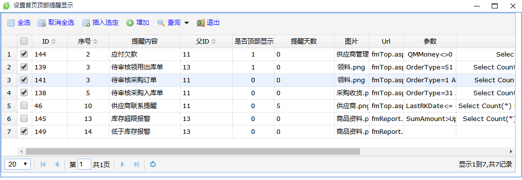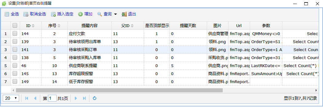 主要是针对首页顶部显示的4个最常用提醒报表。和右侧的提醒显示内容参数的配置。