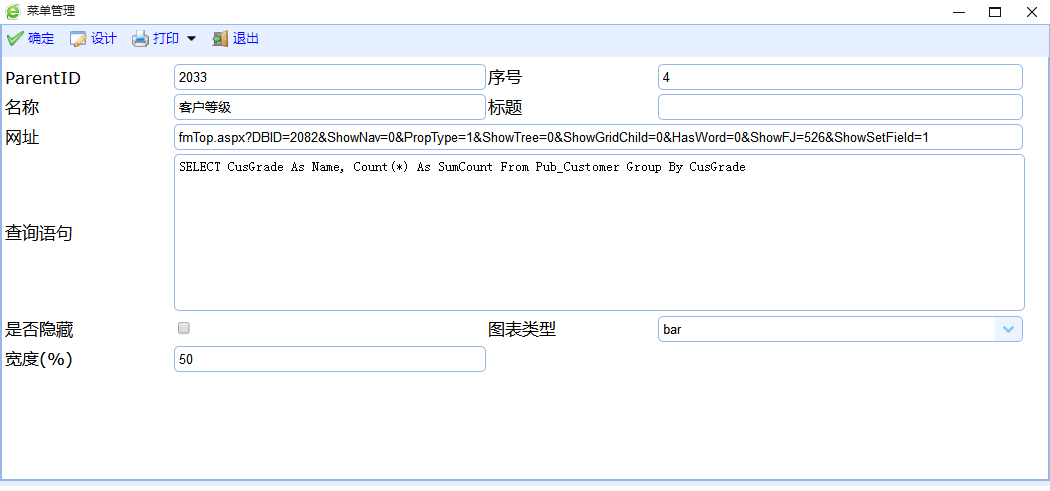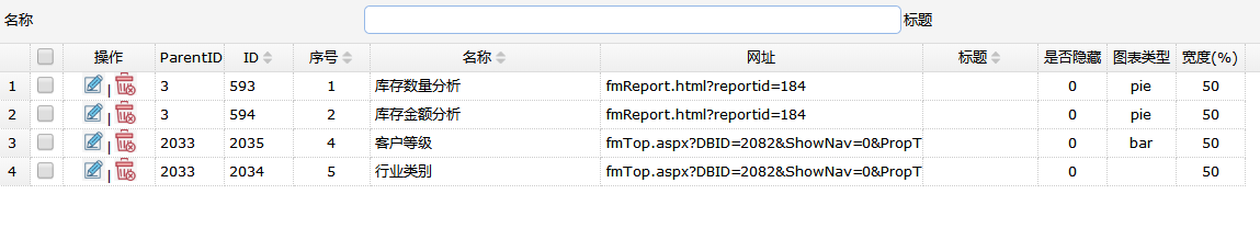 主要参数说明:序号,可以修改显示顺序,是否隐藏,设置是否在首页显示。宽度一般设置为50%,或者100%显示。图表类型,支持pie饼图,和bar柱状图。其他参数用户不要轻易设置,一定要在开发商的指导下进行设置。