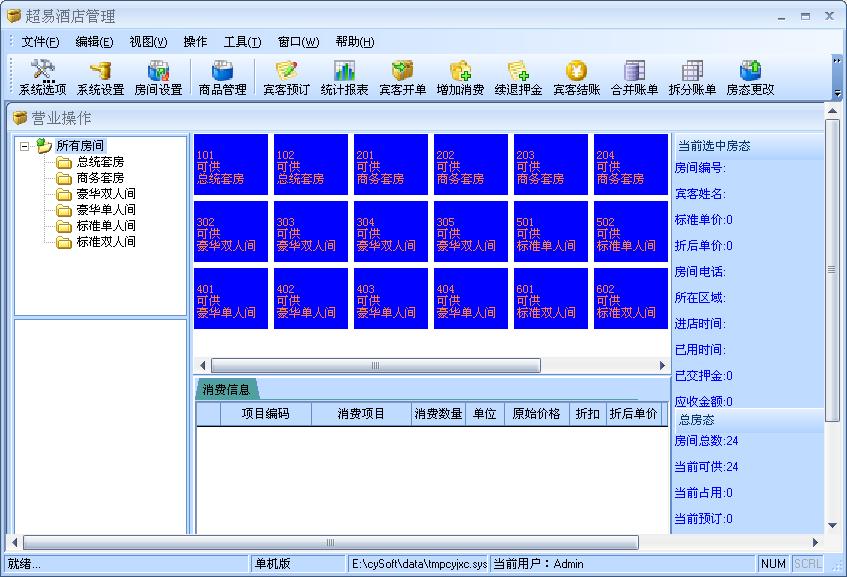 超易酒店管理系统是一款专业的酒店管理软件,是目前市面上性价比最高,最好的酒店管理软件,集前台酒店客房管理,酒店员工管理,酒店客户管理,酒店物品管理,酒店订房系统等强大功能为一身。系统界面简洁优美,操作直观简单,无需专门培训即可正常使用。超易酒店管理软件为酒店业经营者提供了成本分析,利润分析,物流管理等诸多功能,能广泛适用酒店餐饮管理,饭店餐饮管理等场合。软件提供了方便的数据查询功能,也可将各类数据转化为Excel文档 报表统计及打印 系统设置等功能。