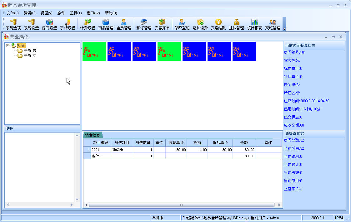 超易会所管理系统是一款专业的会所管理软件,是目前市面上性价比最高,最好的会所管理系统,支持手牌管理、支持房间管理、技师排班管理、服务生状态管理、独立的商品管理、包间预订管理、钟点房和全天房管理、支持会员积分卡、计次卡和储值卡管理。商品资料管理,支持商品采购管理,库存查询管理等。系统界面简洁优美,操作直观简单,无需专门培训即可正常使用。超易会所管理系统为会所制企业经营者提供了成本分析,利润分析,物流管理等诸多功能,能广泛适用休闲娱乐中心,酒店宾馆,洗浴桑拿等会所制企业实现管理信息化理想的会所管理系统软件。软件提供了方便的数据查询功能,也可将各类数据转化为Excel文档 报表统计及打印 系统设置等功能。