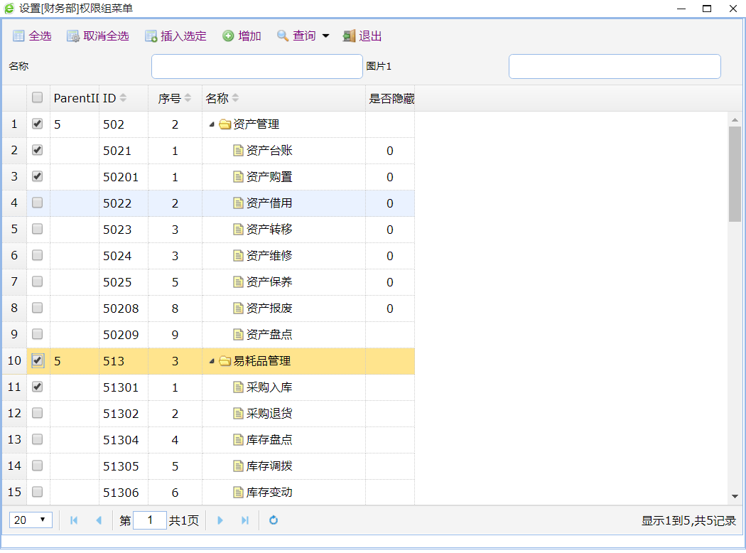 选择某个权限组,勾选要操作的功能点,然后选择【插入选定】即可。