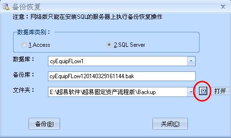 备份路径是默认的,也可点击备份路径后的“…”按钮来更改备份路径。注意:数据库类型单机版选择1.access;网络版选择2.SQL Server进行备份。点击【确定】按钮进行数据备份,备份成功后,点【打开】按钮可快速查找到刚刚备份好的文件。