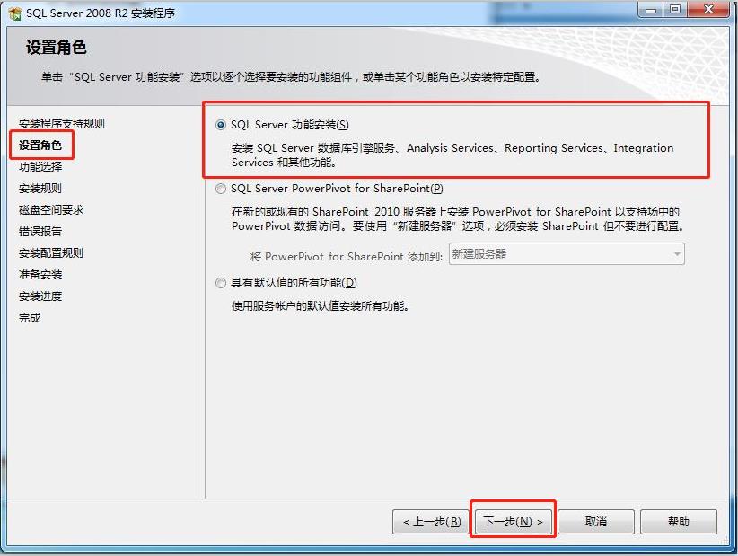 10、在"设置角色"页面中,选择SQL Server  功能安装,单击下一步继续,如图所示: