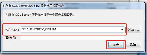 16、在"对所有SQL Server 服务使用相同的账户"页面中,用户名选择为“NT AUTHORIY\SYSTEM”,单击“确定”,如图所示: