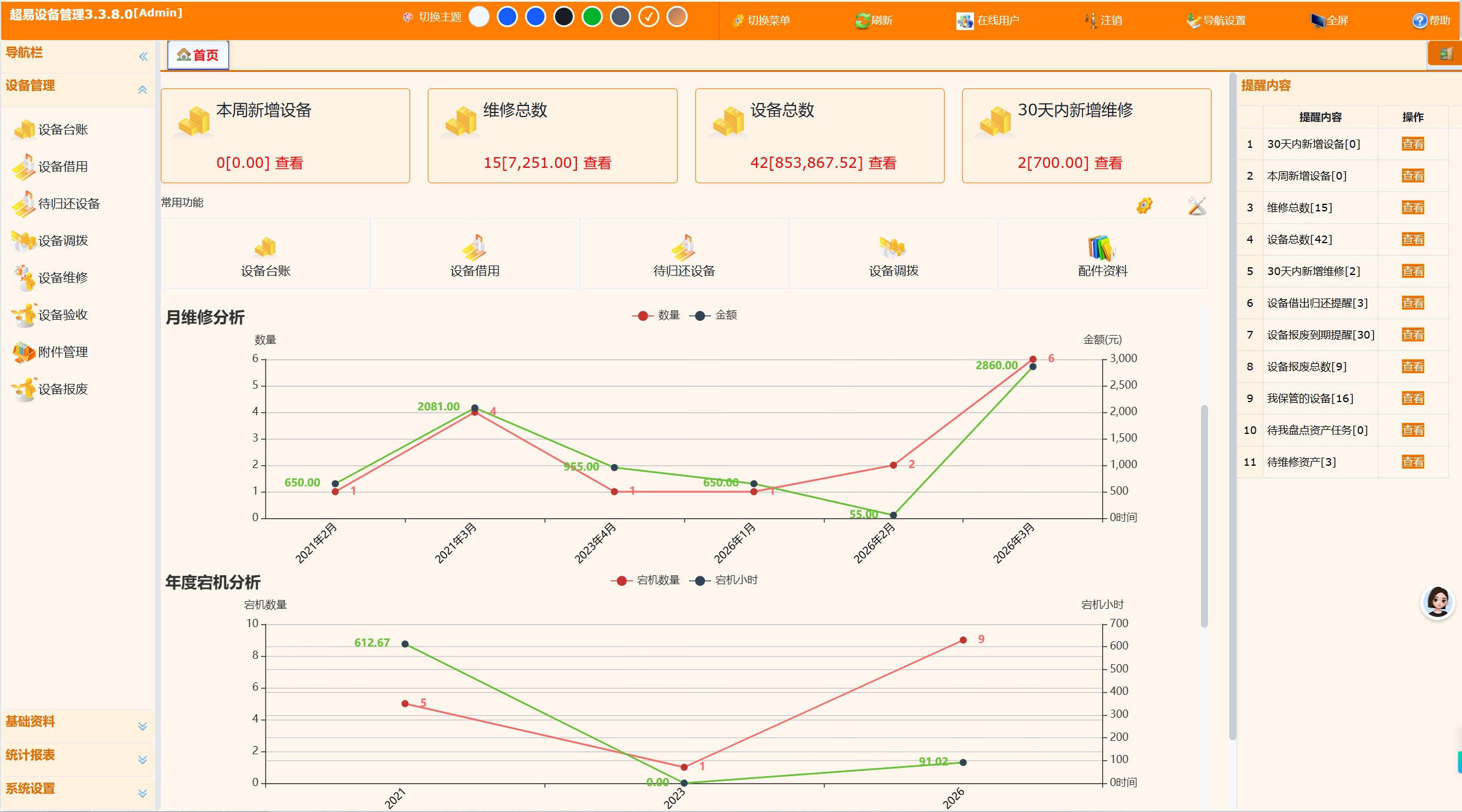 7. 报表与看板高度自定义:支持自定义报表检索条件、自定义首页数据看板,用丰富图表直观展示设备统计、维修分析、库存情况,数据可视化更贴合企业管理习惯。