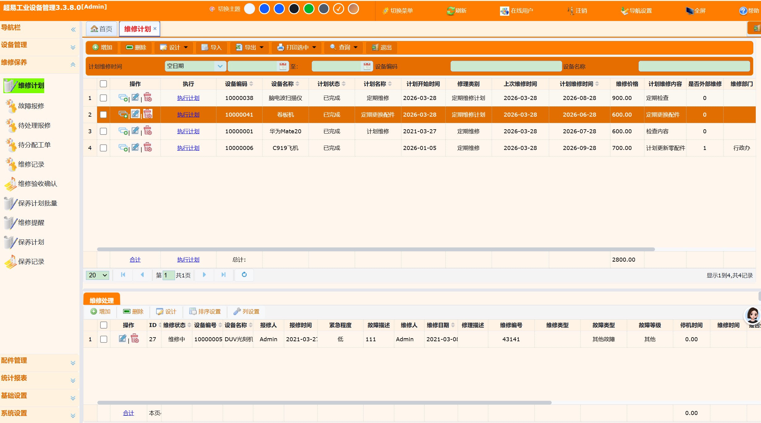 超易系统彻底解决传统维护“靠人工、易遗漏”的痛点,实现维护计划自动化、提醒智能化,推动运维从“被动抢修”转向“预防维护”,维护功能涵盖维修与保养全流程,可自由导入各类维护计划,适配企业多样化需求: